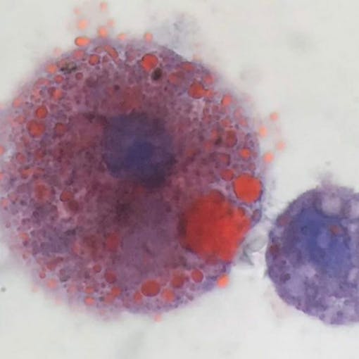 An abnormal lung immune cell (left) filled with oil, versus a healthy immune cell (right). (Courtesy of Andrew Hansen MD, Jordan Valley Medical Center)