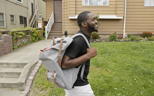 In this 2017 photo, cannabis delivery courier Andre Shavers walks up a street to make a stop in Oakland, Calif. (AP Photo/Eric Risberg)