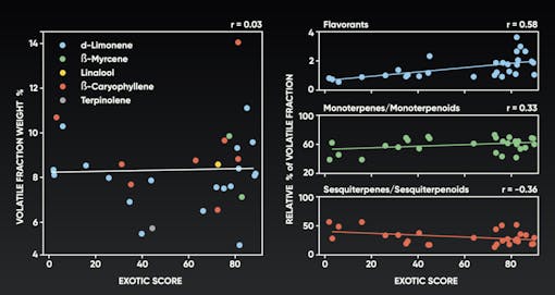 The Abstrax team looked at the correlation between the exotic score of strains and three different classes of volatiles: