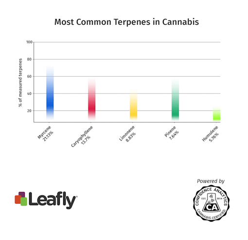 Myrcene is the most abundant terpene in modern commercial cannabis. When we look at thousands of samples of cannabis flower tested by Leafly lab partners, we see this clearly. On average, myrcene represents over 20% of the terpene profile in modern commercial strains, although individual samples vary widely in their terpene content.