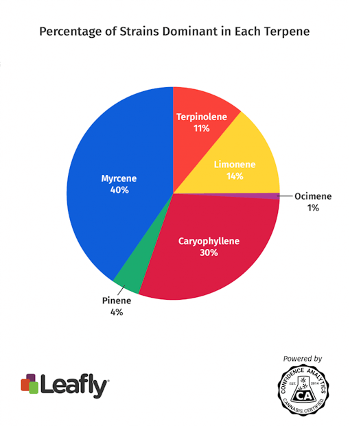 Myrcene is also the most likely cannabis terpene to be dominant in flower. A strain’s “dominant” terpene is simply the terpene present at the highest level. In modern commercial cannabis, only a limited number of terpenes show up as dominant even though there are many more cannabis terpenes in a strain’s overall profile.