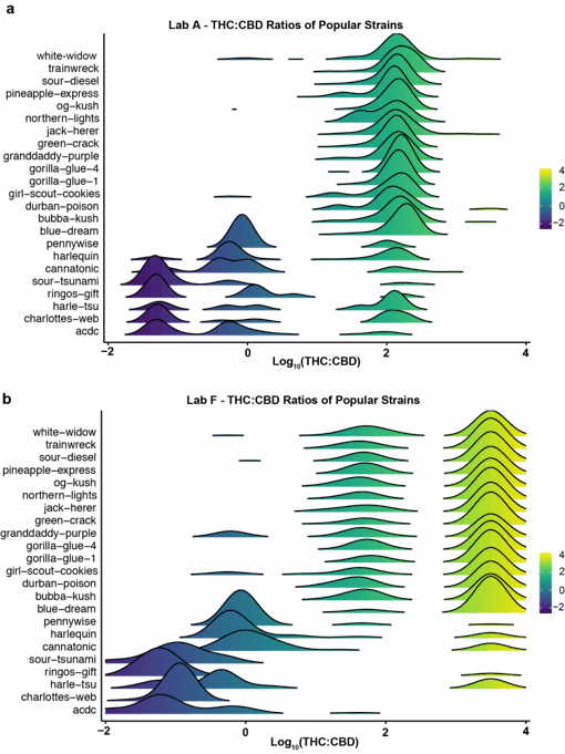 These two charts compare the THC:CBD ratios in popular strains, as analyzed by two different Washington state-certified labs. (Scientific Reports)
