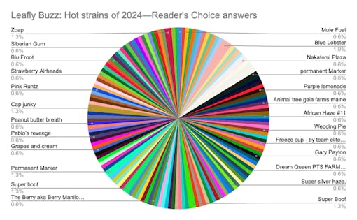And that’s a dozen strains destined to pop in 2024. We’re rooting for even more, of course. Glitter Bomb, Zoap, Sherbanger, and Mule Fuel are blowing up. Help us make it a baker’s dozen 13 hot strains to watch by filling out this one survey question.