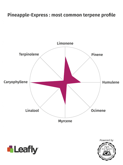 Chemically, Pineapple Express most commonly expresses itself as a caryophyllene-dominant strain with limonene and myrcene following. It is a THC-dominant strain, evident by its powerful high, with levels ranging between 15-19%.