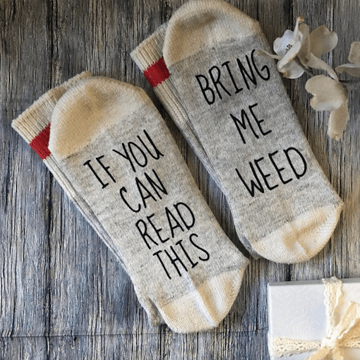 Among the coziest inclusions in our list of favorite comfy cannabis socks, these Bring Me Weed socks get the point across as soon as you put your feet up.