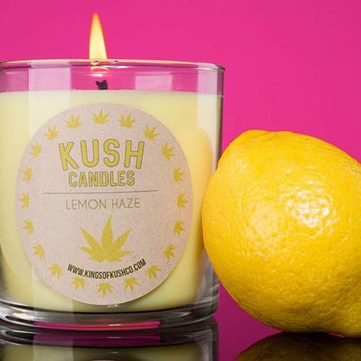 Kush Candles are infused with four of the most commonly found terpenes in cannabis: limonene, pinene, linalool, and myrcene. My coworker burns the Lemon Haze candle from time to time and it is quite pleasant.