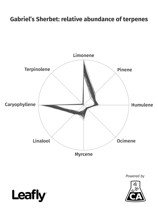 Above you’ll find the testing results of over 100 batches of Gābriel’s Sherbet. As you can see by how the lines overlay each other, their batches retain near-identical terpene profile throughout each grow.