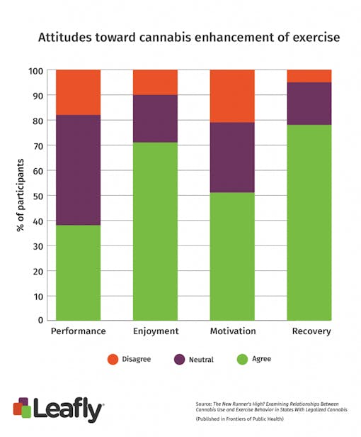 The study’s results were more mixed in terms of how respondents said cannabis affects their exercise performance and motivation. A slim majority agreed that cannabis improves their motivation to exercise, while just over a third of respondents said cannabis enhances their performance. Large portions of respondents were neutral about those effects, and relatively few said that cannabis was counterproductive to exercise.
