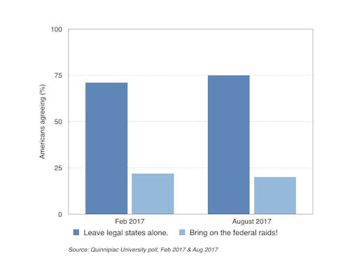 In early 2017, a Quinnipiac University poll found that 71% of Americans opposed any sort of federal intervention in states where voters approved legal marijuana. By late summer, that number had grown to 75%. Three out of four Americans now believe the federal government should leave states alone when it comes to cannabis.