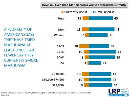 As for support for adult use: Expect it to continue to rise as Americans age. Check out this Lake Research graphic charting the generational differences in support: