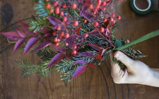 Head down to your local craft store and pop over to your favorite dispensary along the way to load up on supplies. You may choose to buy your greens or, for a budget-friendly option, go to your local tree lot. Most lots will gladly hand over extra branches if asked; all you’ll have to do is get them home and cut them into appropriate sizes. The Douglas fir boughs used in this wreath were given to me by a tree lot, while the berries and red-hued leaves were plucked right out of my own front yard. You’ll need:
