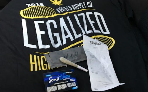 At San Jose’s Airfield Supply Co., which is offering customers free t-shirts, wristbands, and other goodies, Leafly deputy editor Bruce Barcott picked up a SensiChew edible (100 mg, $12) and a half-gram White Widow pre-roll ($7). (He would have bought more, he said, but he’s flying out of state this evening.) Edible prices appear are “notably lower” than in Washington state, he reports.