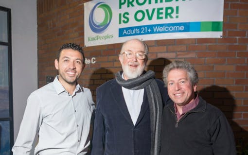 Harborside co-founders Steve DeAngelo and brother Andrew DeAngelo completed the first state-regulated cannabis sale to Henry G. Wykowski, a cannabis attorney who has long represented the iconic dispensary and helped it survive attacks from federal law enforcement, just after 6 a.m. in Oakland on Jan. 1. (Bruce Barcott/Leafly)