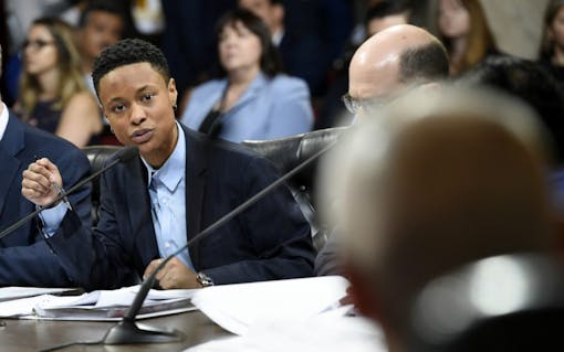 Cat Packer, executive director of the Los Angeles Department of Cannabis Regulation, addresses Los Angeles City Council member Curren Price, foreground, before the council voted unanimously on Dec. 6 to approve new regulations for the legal cannabis industry in the city. (Chris Pizzello/AP)