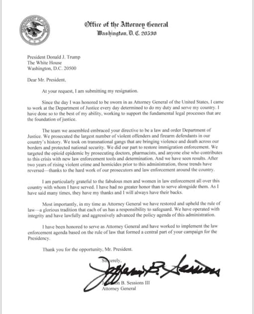 “Dear Mr. President, at your request I am submitting my resignation,” Sessions wrote in his letter.
