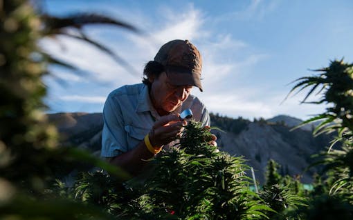 Francoios Nanin, a full-time, seasonal head gardener, uses a magnifying glass to check if a plant is ready to be harvested Sept. 29, 2018 at TNT Ranch. (Daniel Brenner for Leafly)